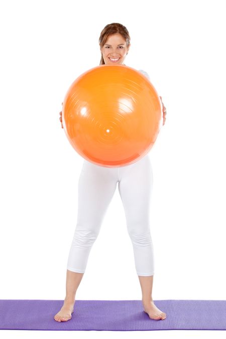 fitness woman smiling with a pilates ball isolated over a white background