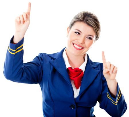 Flight attendant touching an imaginary screen with her fingers