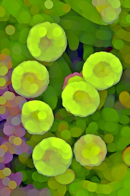Floral abstract of round blooms, mostly yellows and vivid green, surrounded by leaves represented by large, mostly dark green dots, for garden backgrounds with motifs of spring or summer