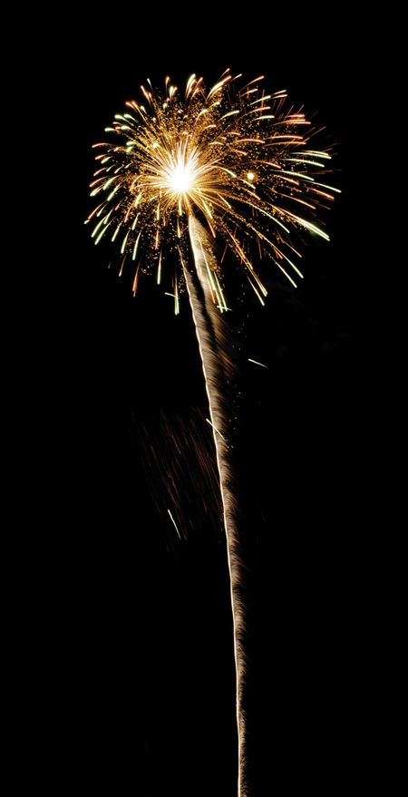 Flowerlike bloom of fireworks with white-hot core and long rocket trail