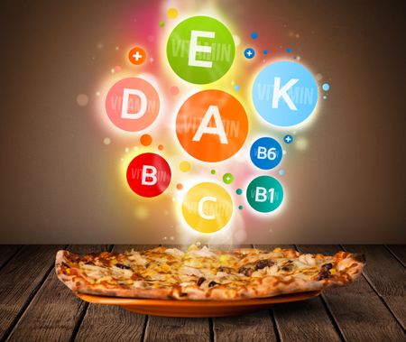 Food plate with delicious meal and healthy colorful vitamin symbols