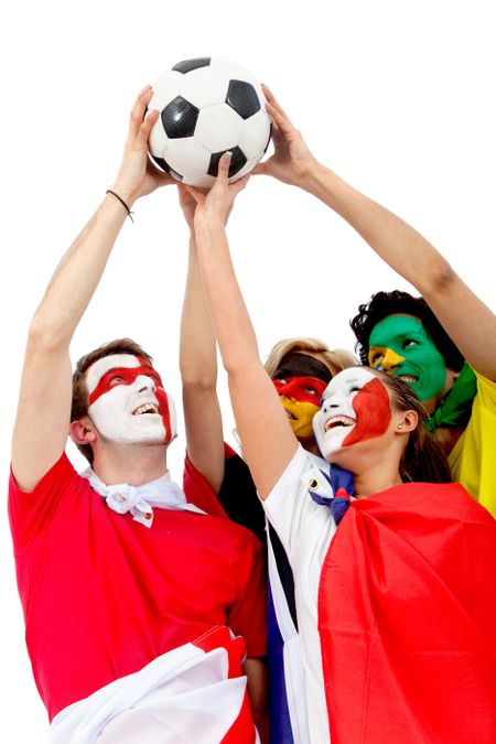 Football fans with flag painted on their faces lifting a ball - isolated over a white background