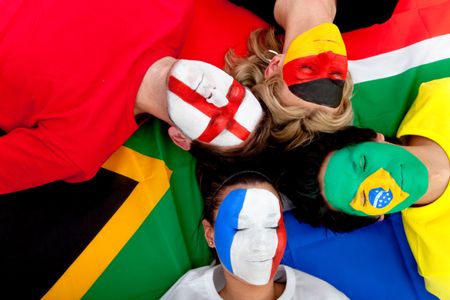 Football fans with painted faces lying on the South African flag - isolated over a white background