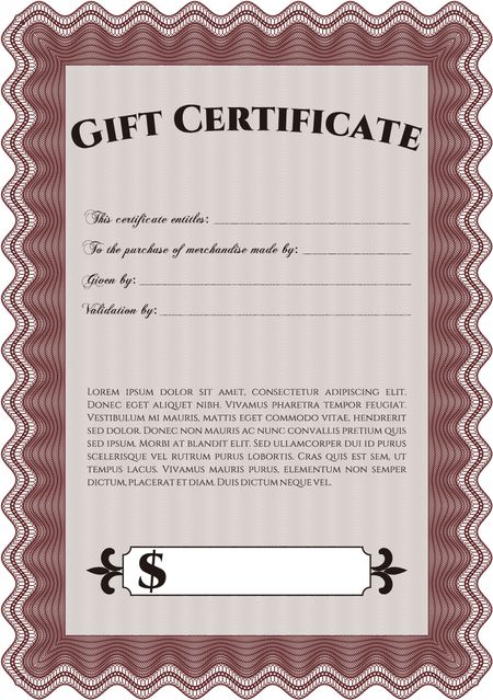 Formal Gift Certificate template. Elegant design. Vector illustration. With guilloche pattern and background.