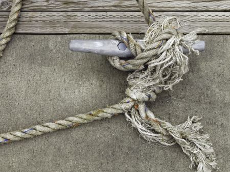 Frazzled line holding a boat to a cleat on dock in marina