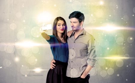 A fresh happy couple taking selfie photo with mobile phone in front of colorful lights glitter wall background concept