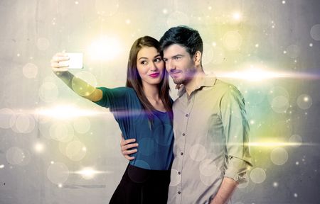 A fresh happy couple taking selfie photo with mobile phone in front of colorful lights glitter wall background concept
