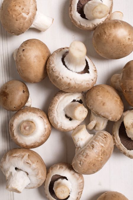 Fresh selection of chestnut mushrooms on a light wooden kitchen surface