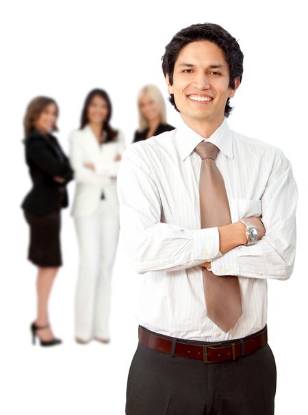 Friendly business man smiling with his team behind him isolated over a white background