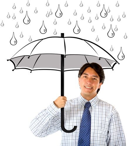 Friendly business man under an umbrella isolated over a white background