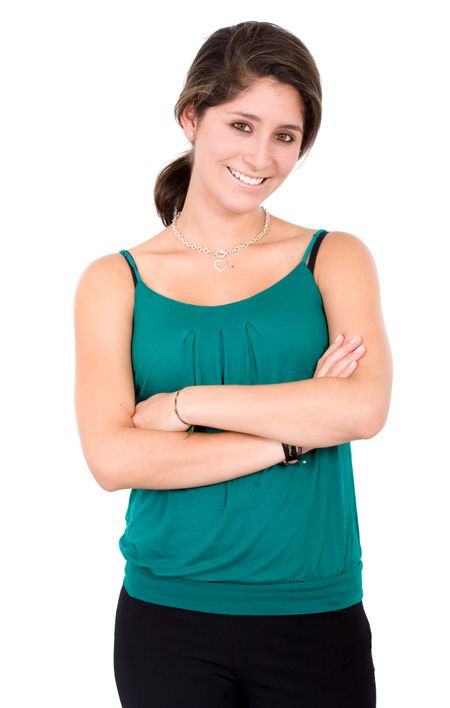 friendly business woman standing wearing elegant clothes - isolated over a white background