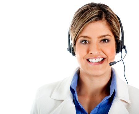 Friendly customer representative wearing a headset and smiling - isolated over white