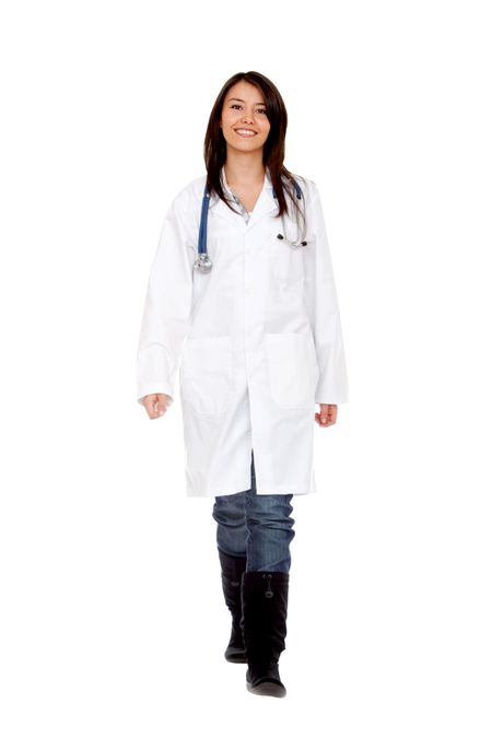 friendly female doctor smiling isolated over white
