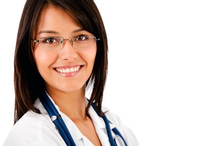 Friendly female doctor smiling - isolated over white