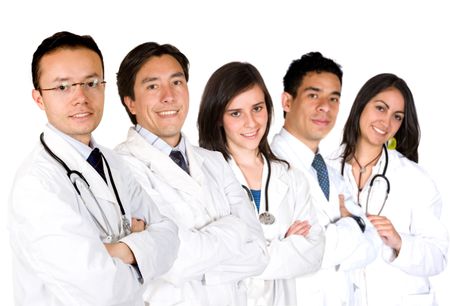 friendly young doctors smiling over a white background - focus is on the male doctor on the left