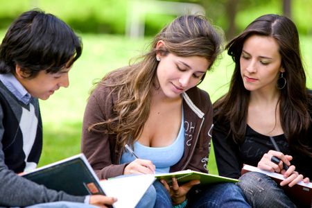 friends or university students smiling outdoors in a park