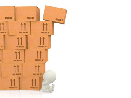 Frustrated 3D man leaning on cardboard boxes - isolated