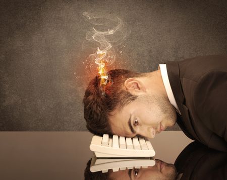 A frustrated businessman resting his head on a keyboard and shouting with his hair on smoke, catching fire