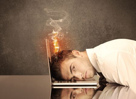A frustrated businessman resting his head on a keyboard and shouting with his hair on smoke, catching fire
