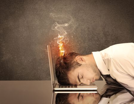 A frustrated businessman resting his head on a keyboard and shouting with his hair on smoke, catching fire