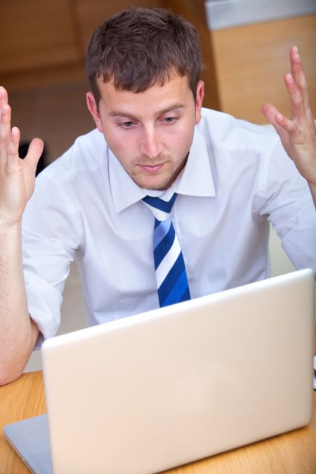 frustrated young business man arguing with the laptop