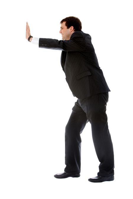 Fullbody business man pushing something imaginary isolated