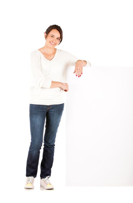 Fullbody woman holding a banner ad - isolated over a white background
