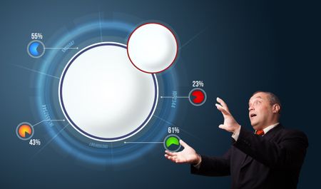 funny businessman in suit presenting abstract modern pie chart with copy space