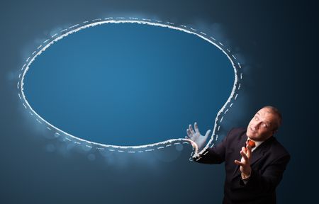 funny businessman in suit presenting speech bubble copy space