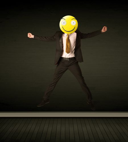 Funny businessman wears yellow smiley face