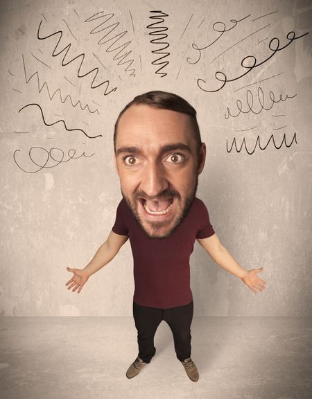Funny guy with big head and drawn curly lines over it