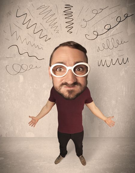 Funny guy with big head and drawn curly lines over it