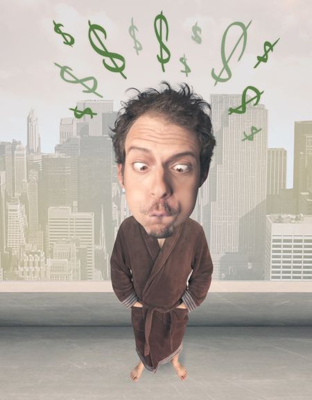 Funny guy with big head and drawn dollar marks over it