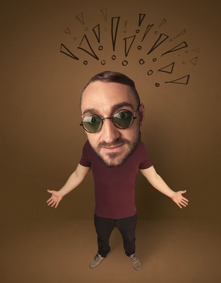 Funny guy with big head and drawn exclamation marks over it