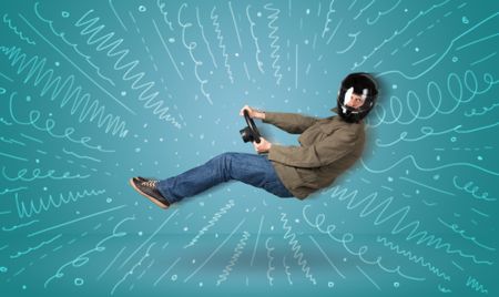 Funny guy drives an imaginary vehicle with drawn lines around him concept