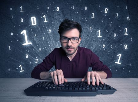 A funny hacker working hard on online passcode scanning and solving passwords with 0 1 numbers illustration in background concept