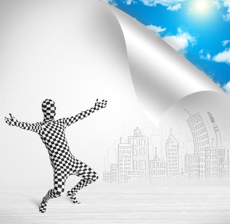 Funny man in body suit escaping from city to nature concept