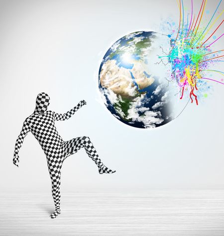 Funny man in body suit looking at colorful splatter 3d earth, Elements of this image furnished by NASA