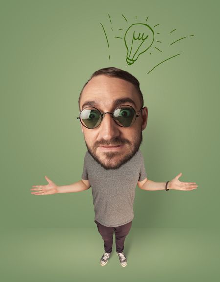 Funny person with big head and drawn idea bulb over it