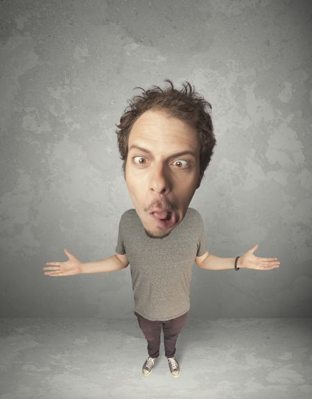 Funny person with big head on gray background