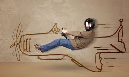 Funny pilot driving a hand drawn airplane on the wall concept