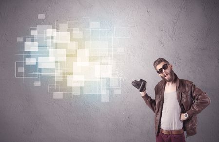 A funny stylish hipster guy capturing bright moments and glowing square pictures with a vintage photo camera illustration concept