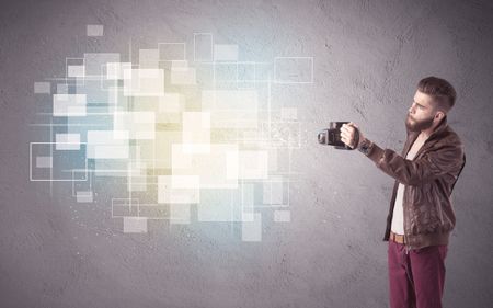 A funny stylish hipster guy capturing bright moments and glowing square pictures with a vintage photo camera illustration concept