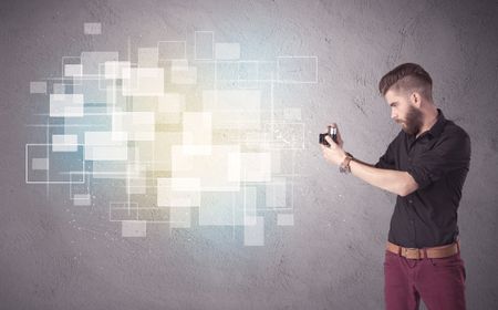 A funny stylish hipster guy capturing bright moments and glowing square pictures with a vintage photo camera illustration concept