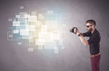 A funny stylish hipster guy capturing bright moments and glowing square pictures with a vintage photo camera illustration concept
