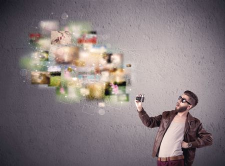 A funny stylish hipster guy capturing moments and memories with a retro photo camera illustration concept