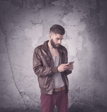 Funny vintage guy with long beard and stylish hair standing in front of urban concrete wall concept