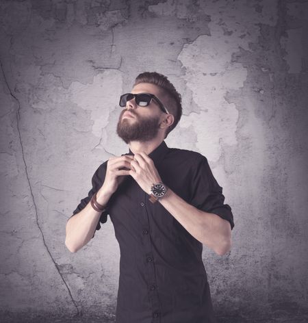 Funny vintage guy with long beard and stylish hair standing in front of urban concrete wall concept