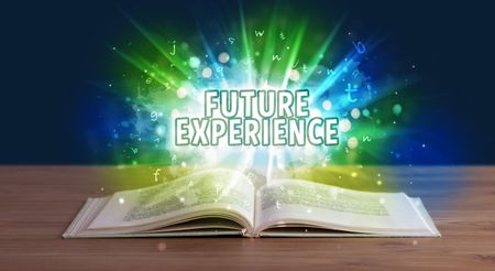 FUTURE EXPERIENCE inscription coming out from an open book, educational concept