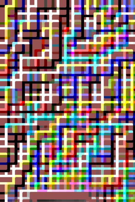 Geometric abstract of multicolored, multilevel grid on wine-red background for themes of complexity, conformity, multiplicity, or interconnection